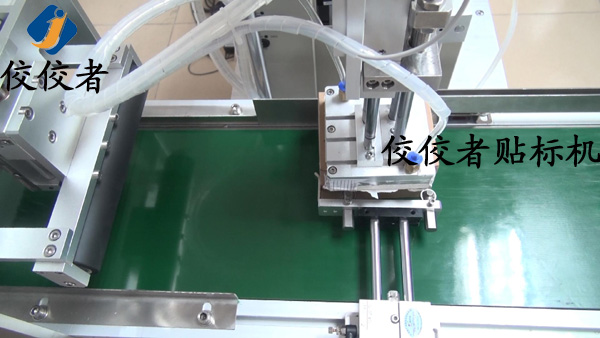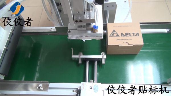 然后,標簽會被轉(zhuǎn)送到輸送帶的上方,等產(chǎn)品經(jīng)過時準確貼上標簽,如下圖: