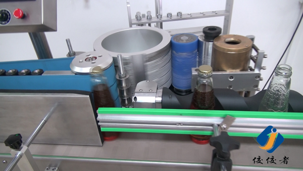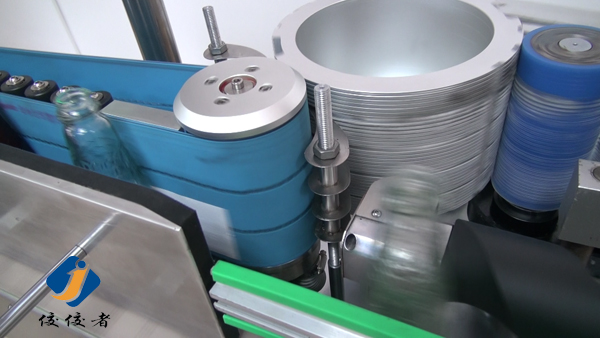 看到上圖中玻璃瓶子后面有一條螺旋狀黑色柱體了嗎?那個圓柱體就把瓶子們的間距調(diào)節(jié)得與出標(biāo)頻率吻合,瓶子們被一個個送到下圖這個傳送帶上進(jìn)行貼標(biāo),傳送帶會準(zhǔn)確地把已經(jīng)糊好漿糊的標(biāo)簽給貼上瓶子,如下圖: