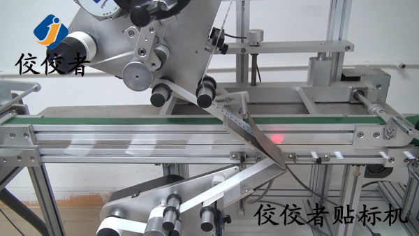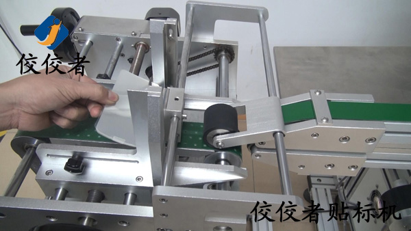 上圖展示的是工作人員將手機(jī)保護(hù)膜放在調(diào)整好寬窄的放料槽中,可一次放置多張,以不超過(guò)擋料板為限,此時(shí)有一個(gè)步驟在圖片中沒(méi)有展示出來(lái),那就是接通電源之后工作人員要調(diào)整好貼標(biāo)頭的高低和前后位置,還有在人機(jī)界面上設(shè)定好相關(guān)參數(shù),這就是全自動(dòng)貼標(biāo)機(jī)的方便之處,設(shè)定好參數(shù)后,開(kāi)動(dòng)該貼標(biāo)簽機(jī),分料機(jī)械將手機(jī)保護(hù)膜一張一張分離出來(lái),貼標(biāo)頭處檢測(cè)電眼檢測(cè)到產(chǎn)品對(duì)產(chǎn)進(jìn)行上下面同時(shí)貼標(biāo),貼標(biāo)完成的產(chǎn)品由后面的輸送帶上進(jìn)行收集?此浦挥泻芏虝r(shí)間,在這個(gè)時(shí)間中,機(jī)器進(jìn)行了一系列的工作,貼標(biāo)頭處檢測(cè)電眼檢測(cè)到產(chǎn)品,將信號(hào)傳給貼標(biāo)頭步進(jìn)電機(jī),電機(jī)工作將標(biāo)簽剝出,同時(shí)貼標(biāo)頭的測(cè)標(biāo)電眼檢測(cè)到下一張標(biāo)簽,給信號(hào)貼標(biāo)頭步時(shí)電機(jī),步進(jìn)電機(jī)停止工作,這樣完成檢測(cè)一個(gè)產(chǎn)品出一張標(biāo)簽并貼在產(chǎn)品上。(貼標(biāo)過(guò)程:自動(dòng)分出產(chǎn)在—>自動(dòng)檢測(cè)貼標(biāo)并覆標(biāo)—>自動(dòng)收集已貼標(biāo)產(chǎn)品。)如下圖: