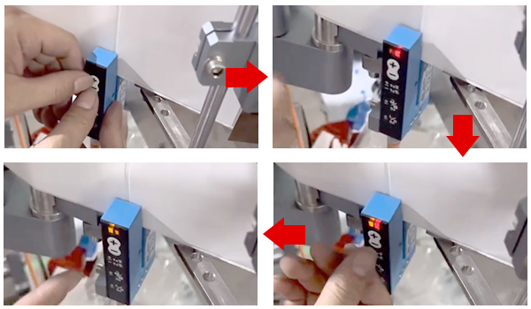 2)將有標(biāo)簽的地方置于電眼的U 型槽內(nèi),此時(shí)按一下正號(hào)鍵和負(fù)號(hào)鍵,燈閃紅光;