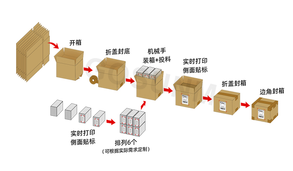 ◆ 第三步:進(jìn)入箱子貼標(biāo)+一字型折蓋封箱機(jī)——自動進(jìn)行一字型封箱;