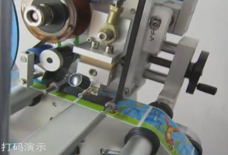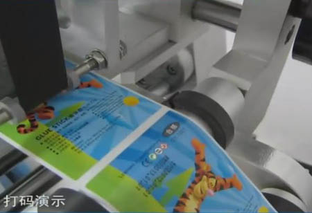對產(chǎn)品一邊進(jìn)行貼標(biāo),一邊進(jìn)行打印文字。已經(jīng)是一個很容易就能實(shí)現(xiàn)的功能了。實(shí)現(xiàn)這個即時打印功能的東東,叫打碼機(jī)。一般的標(biāo)準(zhǔn)貼標(biāo)設(shè)備上都是可以進(jìn)行選配這個打碼機(jī)的。也就是說,幾乎所有的標(biāo)準(zhǔn)設(shè)備都可以進(jìn)行即時打印功能。我公司有一款典型的即時打印貼標(biāo)設(shè)備:全自動臥式圓瓶貼標(biāo)機(jī)。