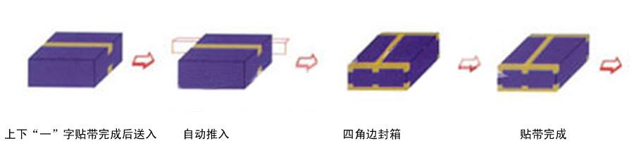 ◆ 操作流程:上下“一”字貼帶完成后送入—自動推入?四角邊封箱?貼帶完成